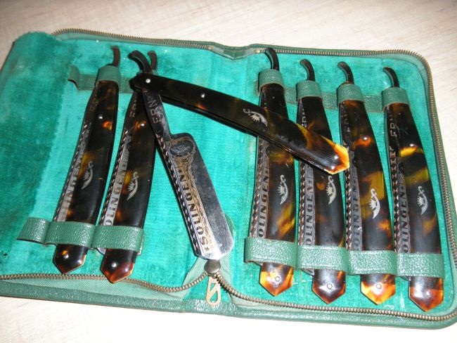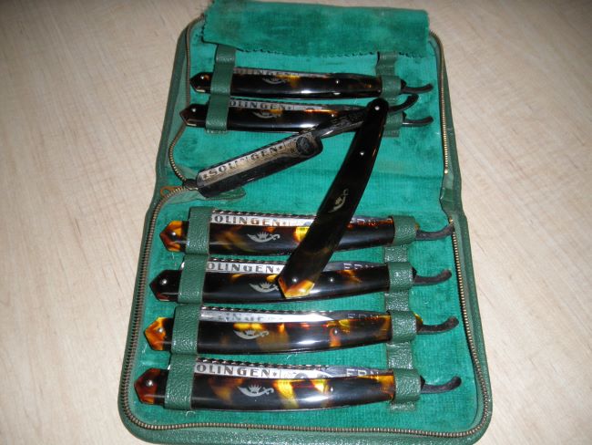GENTS: I have in my possession one of a kind made razors back in the 50's.This razors are 3 pin,have turtle sides,width of blade is 3/4,has gold etching on the blade and has ERN on the blade.Razors were made in Solingen,GERMNY.There are 7 razors in the set.Every blade has stamp on a day of the week.The collection comes in a green case.I PAID $700.00 for the collection.