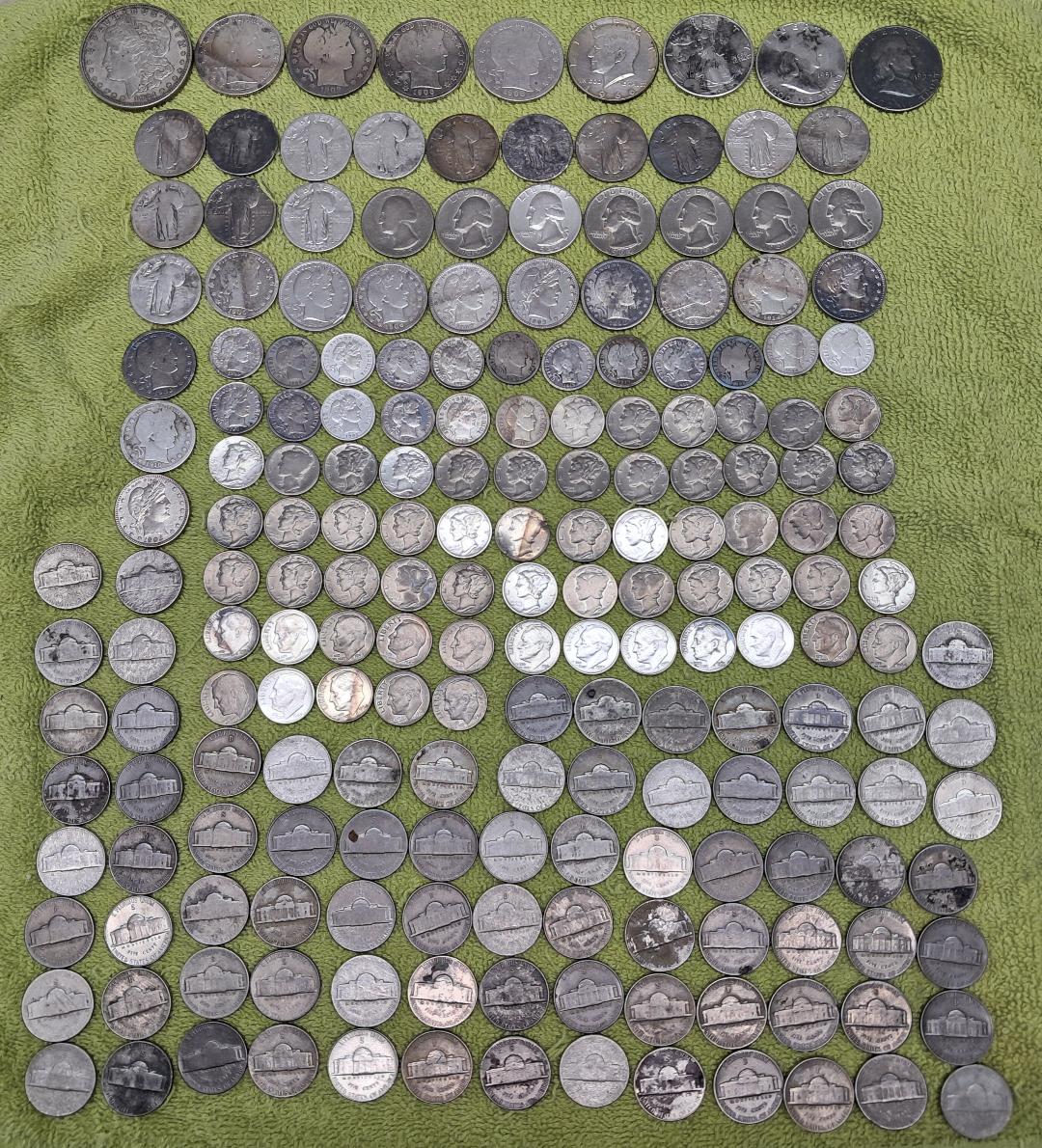 Total pure silver: Add them up → 0.773 + 1.448 + 0.362 + 0.724 + 0.148 + 2.353 + 2.353 + 1.267 + 1.296 + 3.024 + 1.224 + 4.424 = ~19.4 troy ounces (precisely around 19.40 oz when using more decimal places like 0.7734 for Morgan, 0.36169 for halves, 0.18084 for quarters, 0.07234 for dimes, and 0.05626 for war nickels).