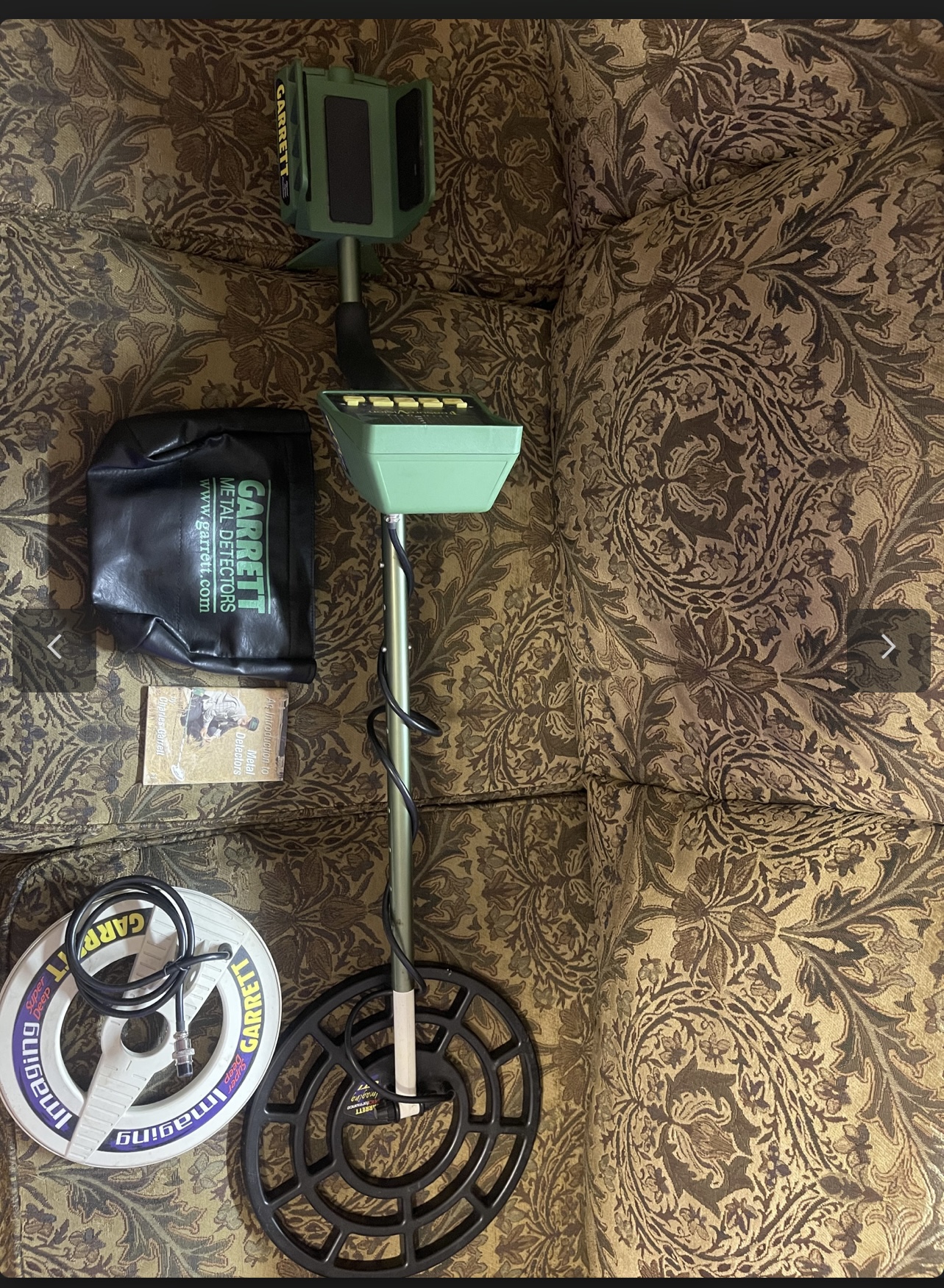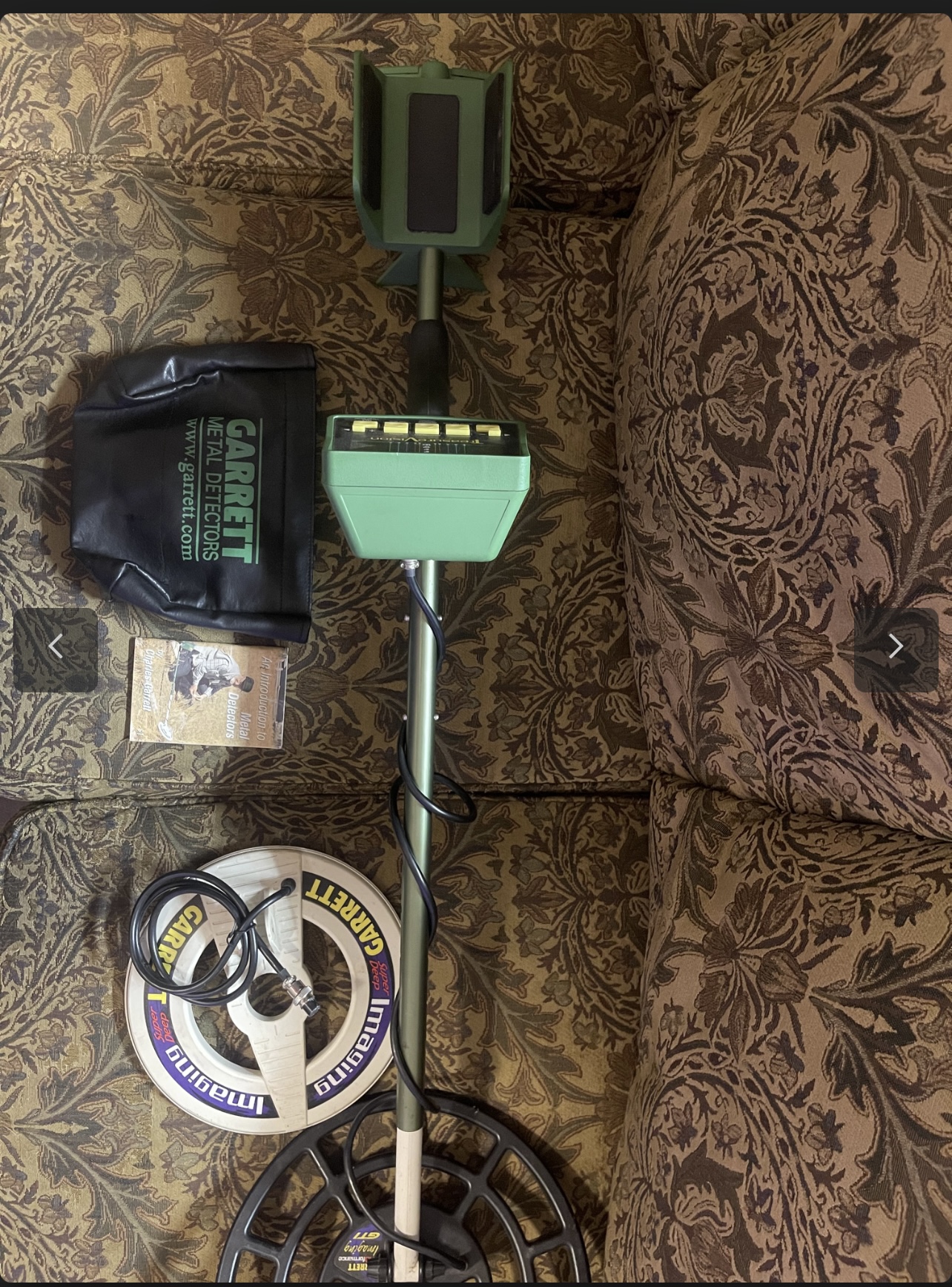 Make offer,Very low hour detector,comes with everything pictured ,I have a printed manual and the original Garrett headphones not pictured that will be included,it works flawlessly the sticker on top of control housing was missing when I bought it,the plastic inside the top flap of bag is deteriorated and loose in between the inner and outer fabrics $500 shipped ,if using PayPal add 3% for good & services or friends and family or postal money order thanks for looking