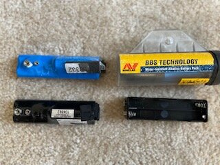 Has one good battery pack, maybe. Been sitting for years and capacity is questionable. The AA pack is cracked and someone did a wire spice at some point. I installed a re-charge battery in the AA pack. I will include extra batteries. I cant tell which ones will hold a good charge for any length of time as they have been sitting for years. You'll have to try them out or buy a new one. Will include battery adapter and a brand new Minelab Charger.