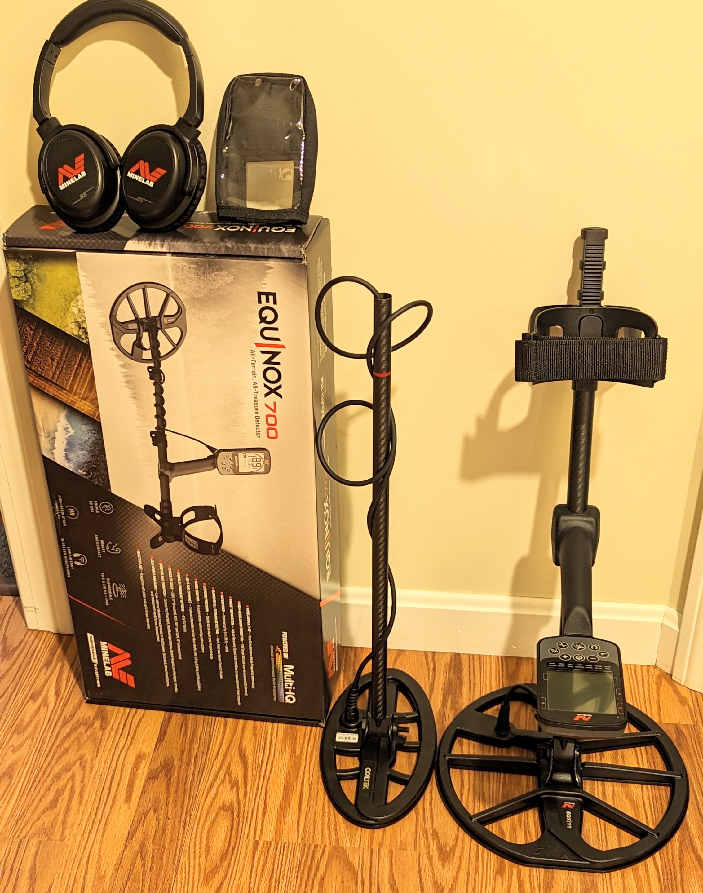 Minelab Equinox 700 used once for about 2 hours at seeded hunt. Includes wireless ML85 headphones, environment cover, screen cover ( already on) also you will get a Coiltek 10x5 with spare carbon fiber lower rod coil was used in seeded hunt for about 2 hours shows little wear. Stock coil has not been used at all. Also includes manual and charging hardware for detector and headphones.Both the detector and Coiltek coil were purchased on May 22nd. Warranty has not yet been registered. Detector sells for 749.00, Coiltek coil, 251.00 and spare Minelab rod, 65.00 . Do the Math, this is an excellent package at$ 100.00's of dollars less than you would spend purchasing everything separately. Free Fast Shipping included PayPal payment. Trusted longtime member. Message me if interested.