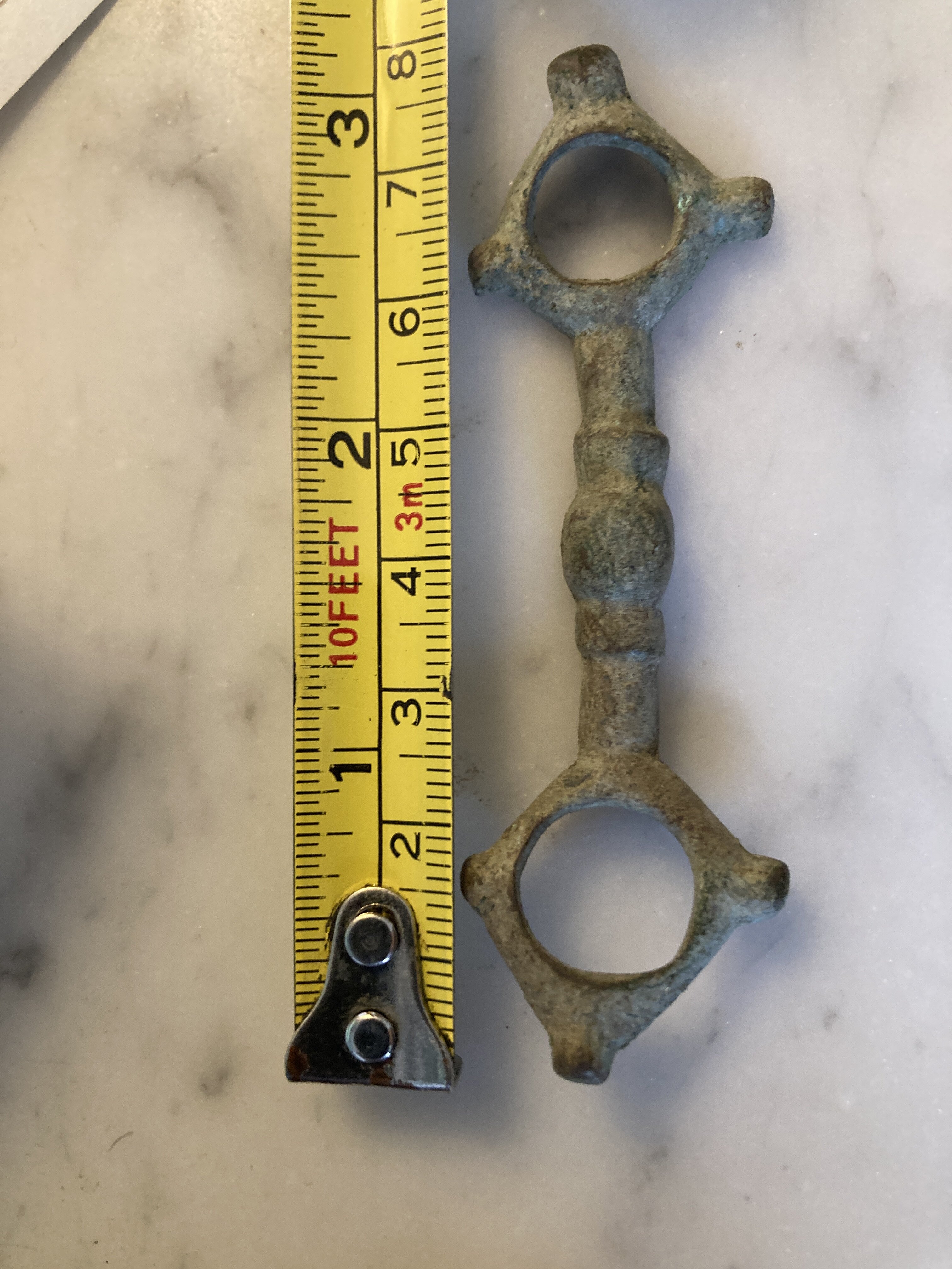 Found this amongst finds but can't remember where I found it. It's bronze/brass and was obviously cast in a 'trough' mould as is flat on the back. My guess is possibly a cloak fastener.
