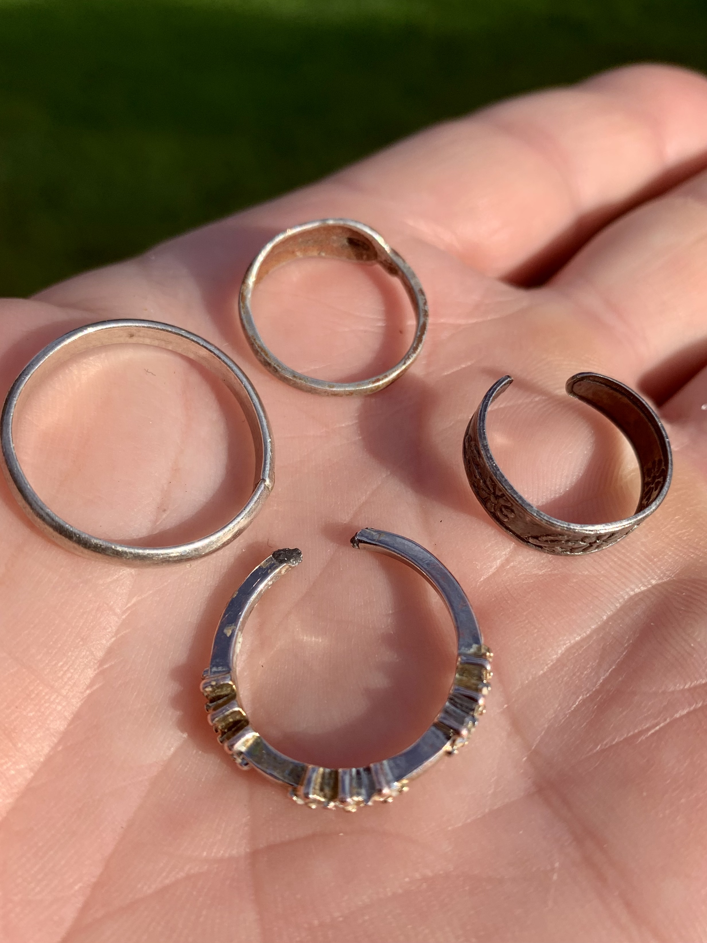Mostly silver!…..Not sure on the earring? Mark is usually on holder, which is missing.The sea was rough so, hunted along the wet sand only. The targets were spread out & sand was soft. I’m certain I missed some deeper targets due to conditions (well sanded)!